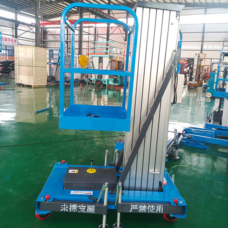 The aluminum alloy lifting platform is made of high-strength premium aluminum alloy, with a manganese steel reinforced chassis and four supporting legs for safety and reliability. The equipment comes standard with both ground control and remote control lift options, making it convenient for personnel working at heights to operate. The equipment is compact and lightweight, easy to use, time-saving, and efficient, making it ideal for accessing narrow spaces or elevator cabins.